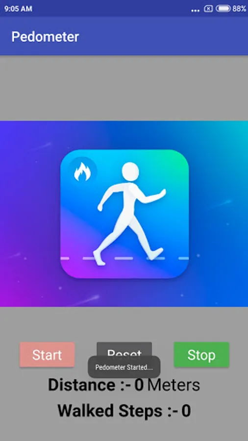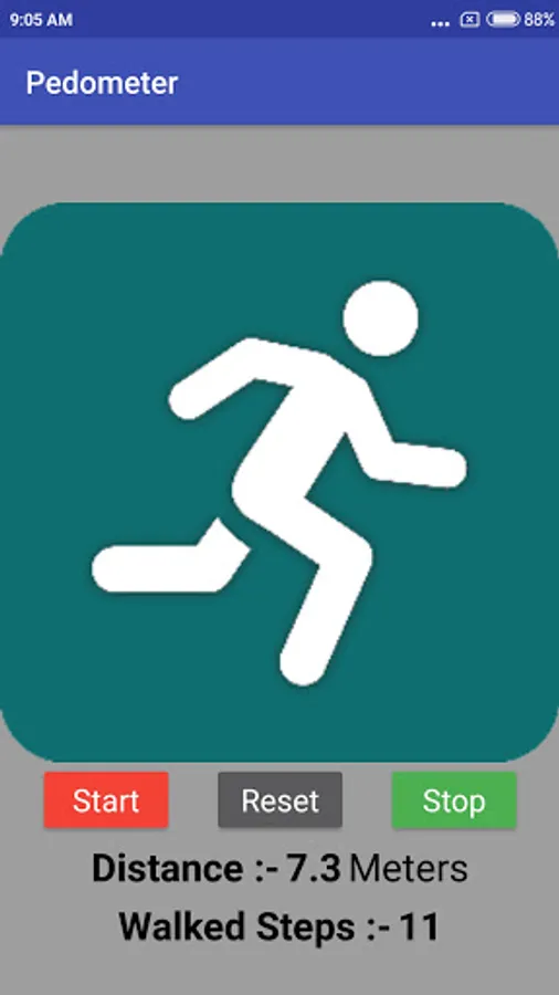 It is a pedometer app, in which user can click start button to start it and stop button to stop it or reset button to reset it.