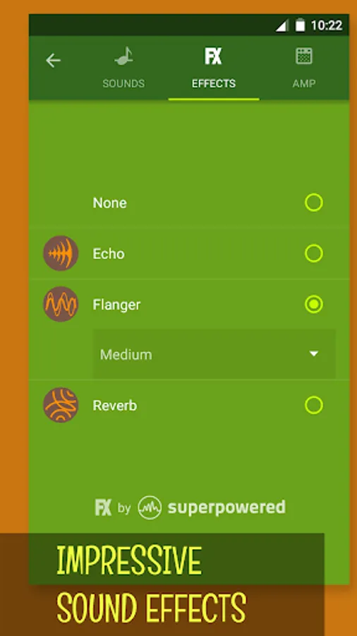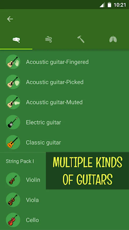Pick among a large categorized set of sounds including a number of kinds of guitars and playing modes and the sounds of all sorts of musical instruments. Make the guitar sound as a flute or a piano! Funny and exotic sounds are included too, like those from animals. Or even pick a different one for each string! What about creating a band with a human chorus for the lows and a violin for the highs?