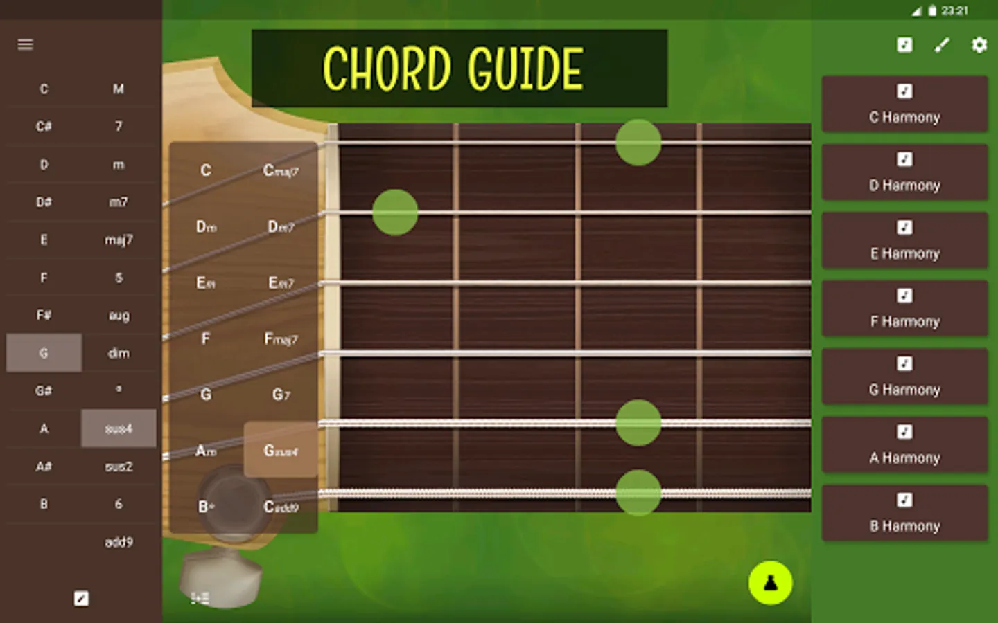 An easy-to-use interface allows you to change your chord selection on the go. You'll see at all times a diagram showing finger positions. Very useful for learners or for those who play already and need to recall a chord.