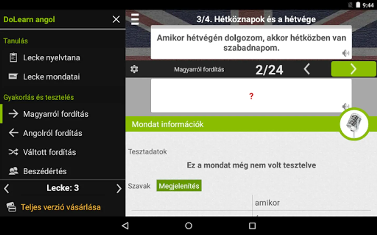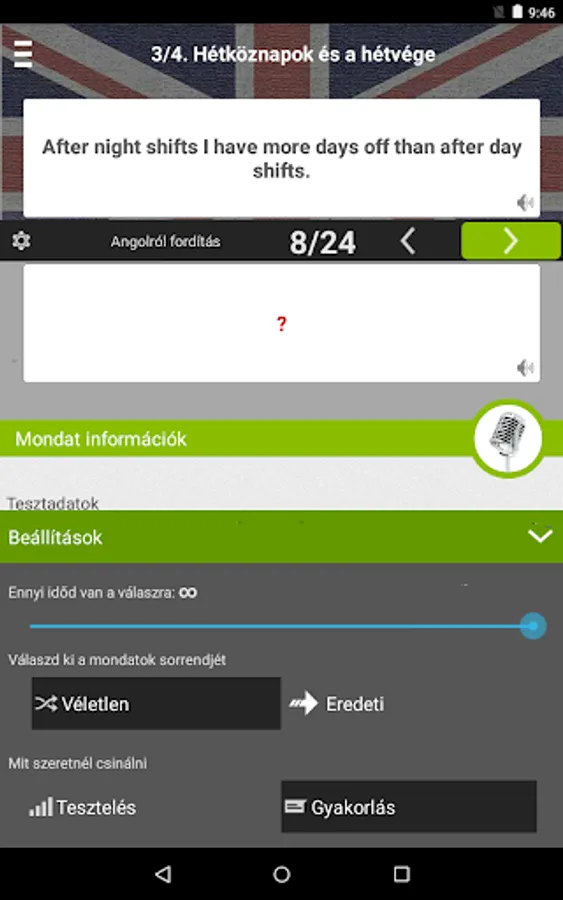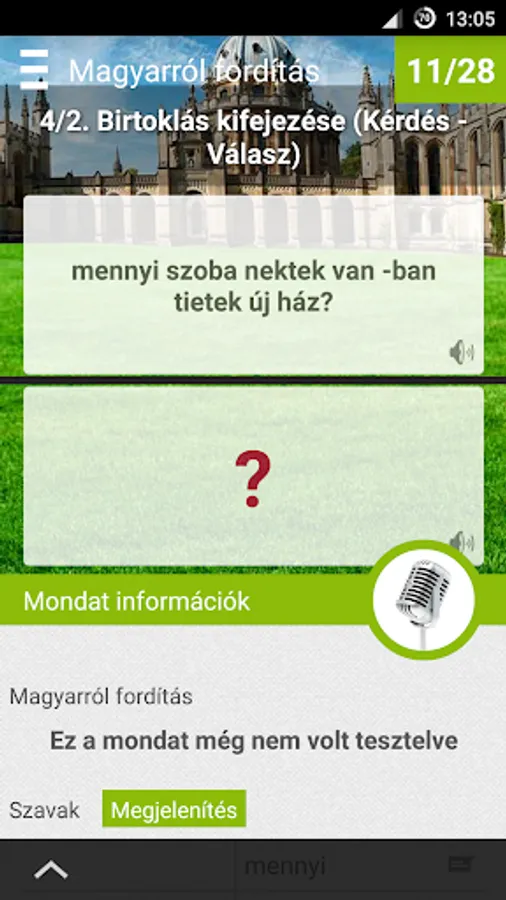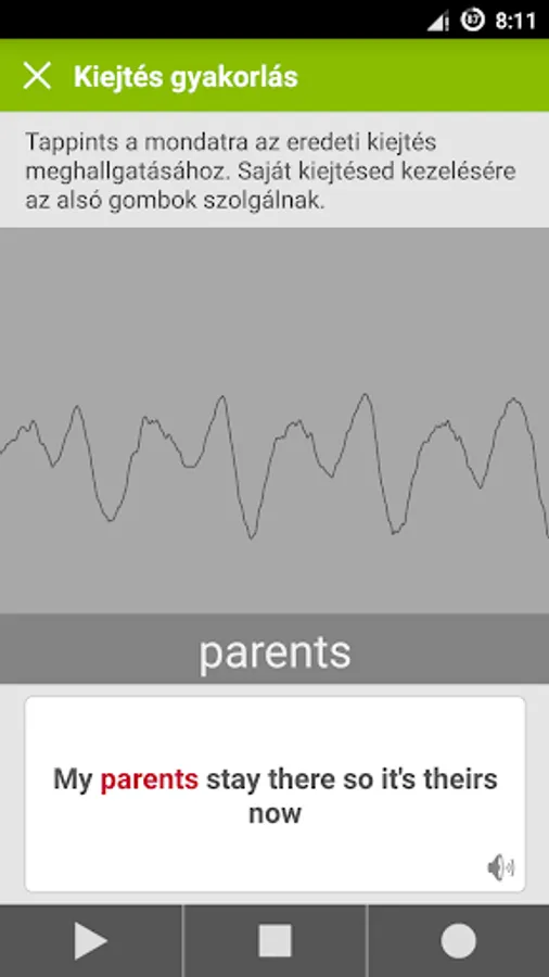 We Hungarians in learning English is one of the biggest difficulties is that the English sentence structure is radically different from the anyanyelvünktől. The difference is easy to understand, touch and hold the Hungarian sentence, the others see. Another difficulty mastering the correct pronunciation. Tap the microphone button to enter the pronunciation practitioners. There you can add your own accent and compare it with the correct native accent.