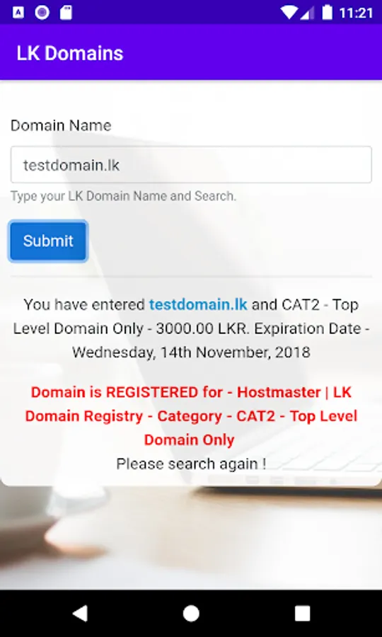 .LK Domain is the Top Level Domain Name Extention of Sri Lanka. There you can search your LK Domain's availability, expire dates, category type and price. You can simply enter your LK Domain with or without ".LK" part and search. After a few seconds, you will get the results.