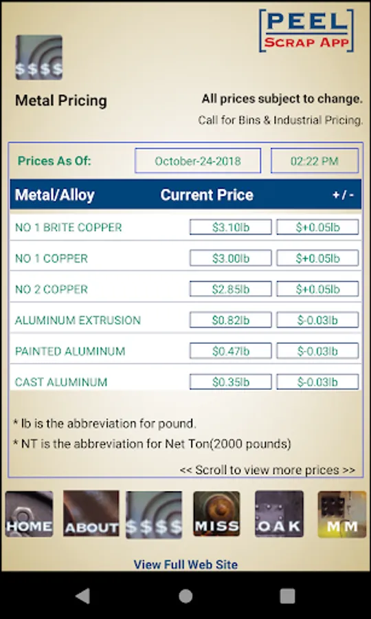 The App provides mobile users with up-to-date pricing information on a number of the ferrous and non ferrous metals and end-of-life electronics which Peel purchases from their customers. The price chart is an extension of Peel’s in-house information system which tracks commodity prices from market sources. Buying prices are routinely updated on an automatic basis as selling prices change.
