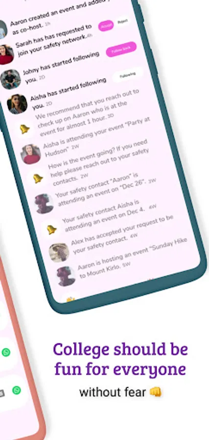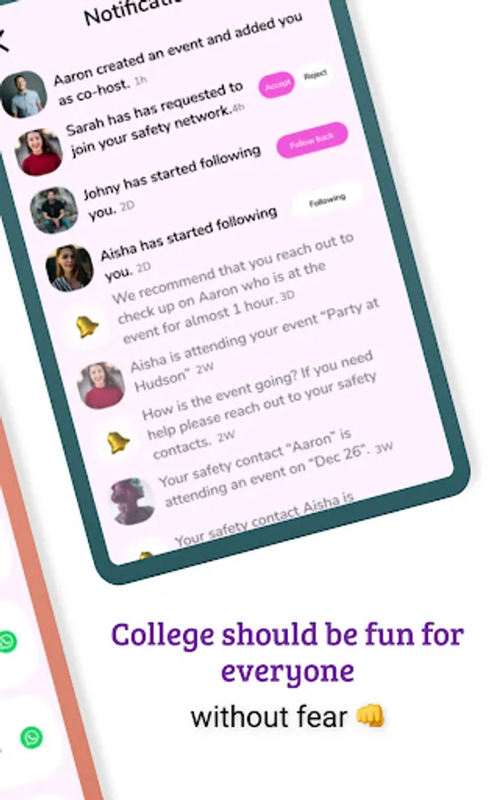 ⛑ Student’s have a safety network of close friends who can virtually check up on the student to ensure safety during events.