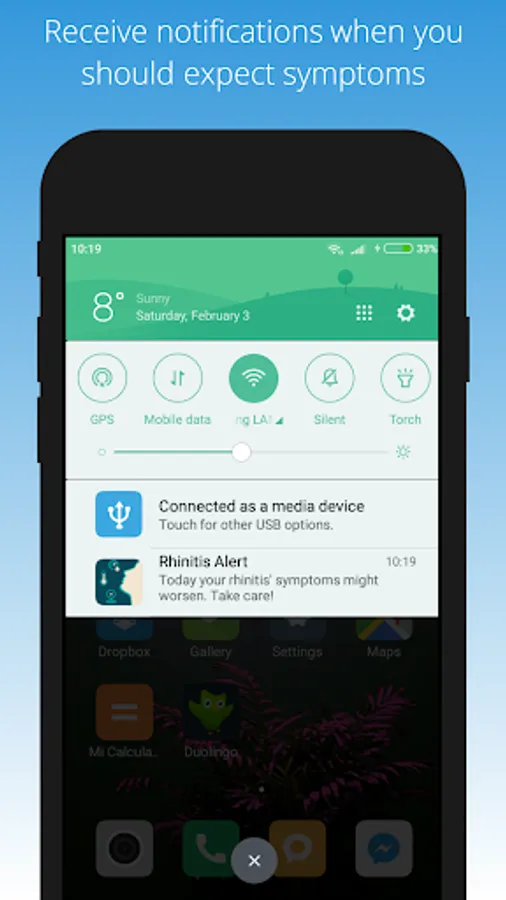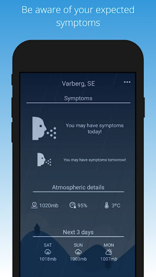 With Rhinitis Alert, you can be notified when barometric pressure, humidity and/or temperature have abrupt changes or go below/above a certain level. Also, with the symptom feedback option and 5-day history, you can relate weather events with your symptoms!