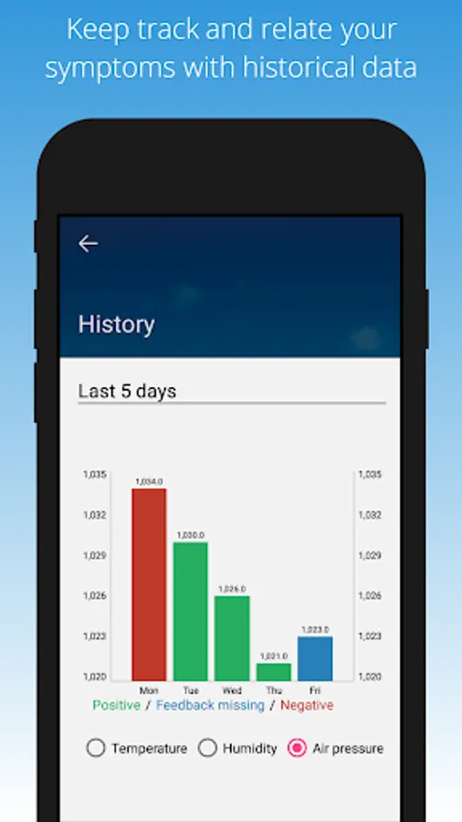 - 5 day history charts, showing temperature, barometric pressure or humidity in comparison with the symptoms feedback given;
