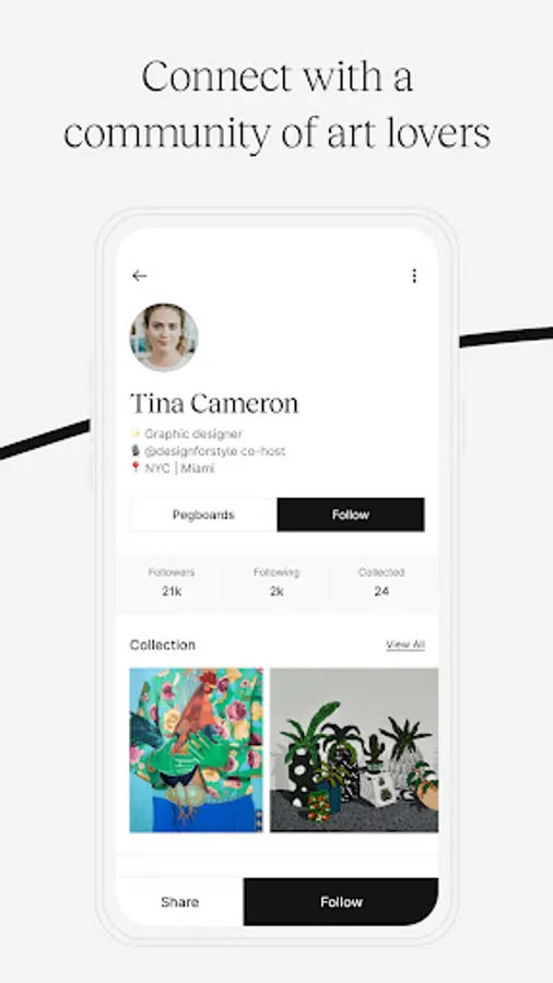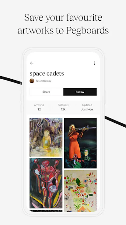 Pegboards make it easy to show off your curatorial skills. Follow artists, galleries, and other collectors to stay up to date with the art world.