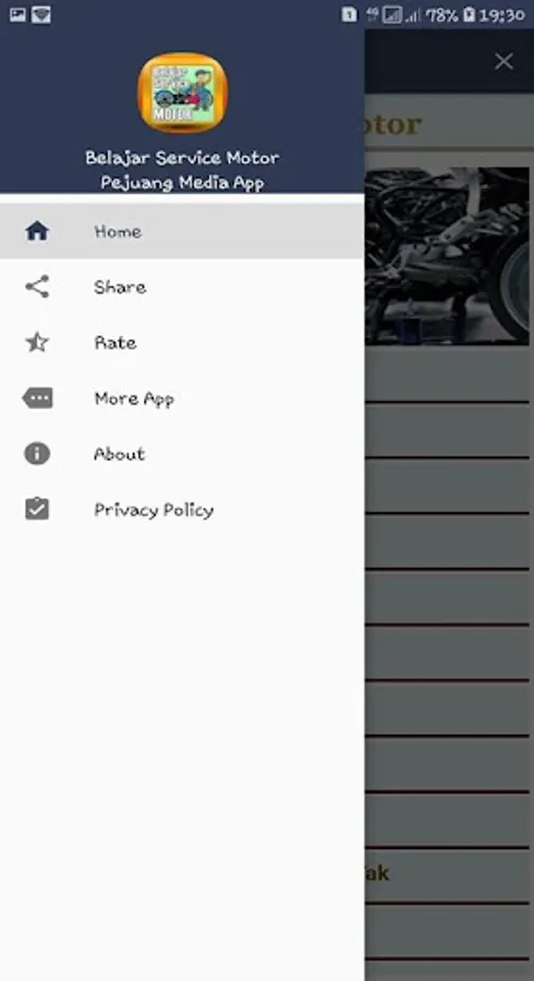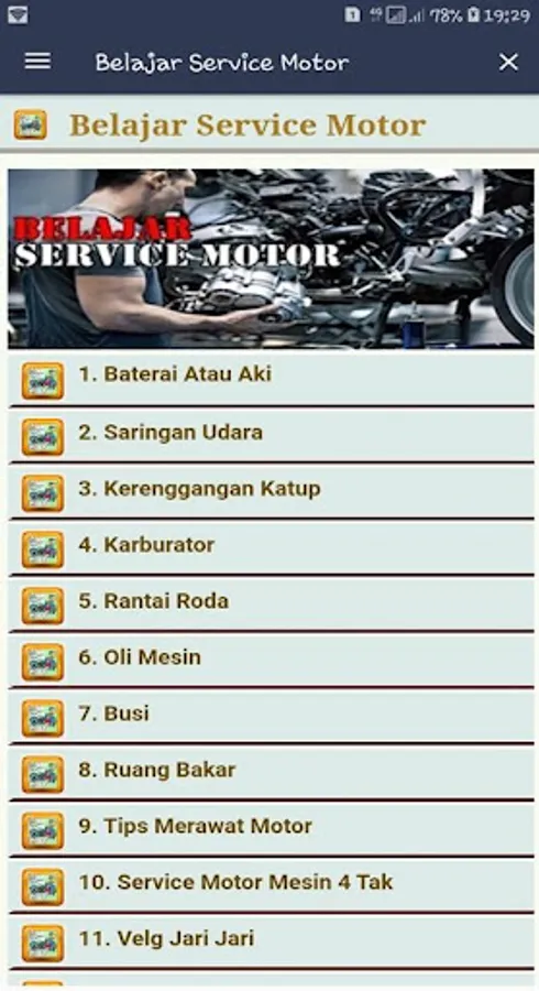 This Motorbike Service Learning Application is an application that contains tutorial material for self-service and repair of Motorbikes. This application is perfect for those of you who want to learn to find out how to repair your own motorbike. In this application, you will be taught some material on how to deal with problems or problems when the motorbike is damaged.