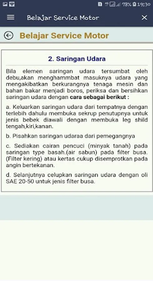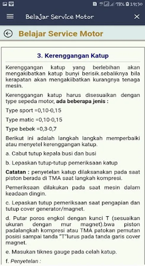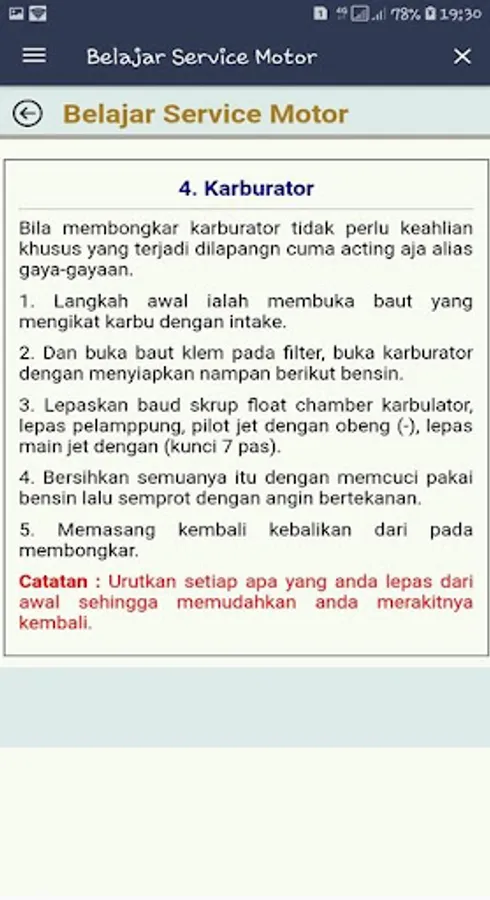 There is a lot of material presented in this Learning Motorcycle Service. Starting from the way of introducing engines and components on motorbikes, to how to service materials damage various kinds of damage to the motorbike. So that for those of you who want to learn motorcycle self-service, then you don't need to hesitate to download this application.