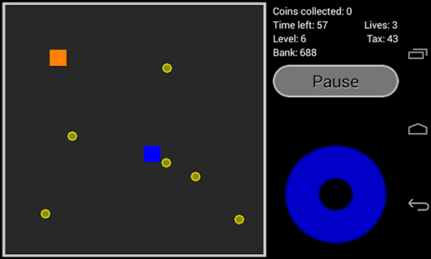 You must collect as many coins as you can to pay off government taxes for 25 levels, and then you will be awarded a large research grant, but the evil Red Square Corporation has sent along some of their own agents to collect coins before you can get them, and in later levels they even call in help from the Orange Assassins' Guild. Fortunately your friends in R&D have created some helpful power-ups to speed you up, stop time or magnetically attract coins.