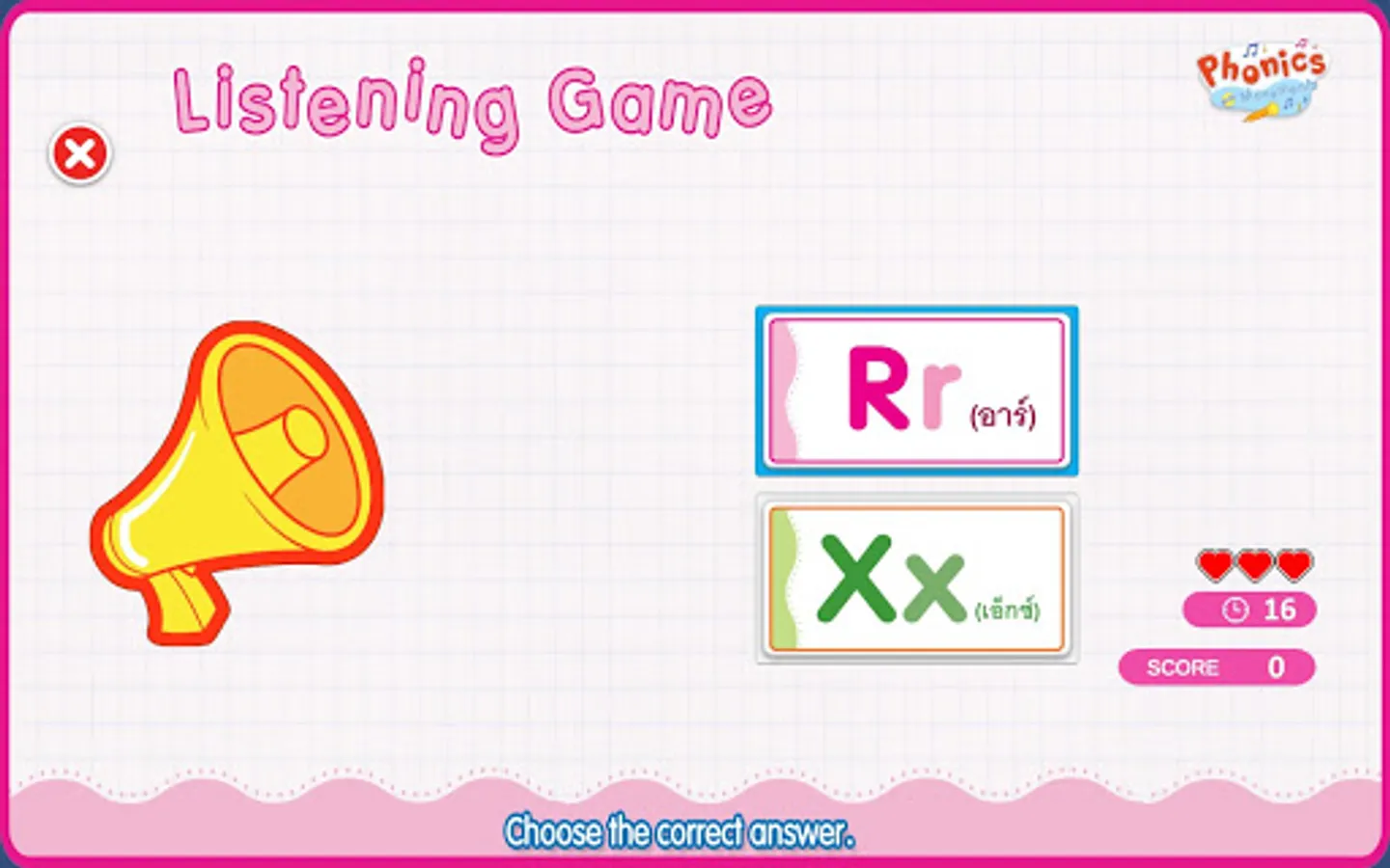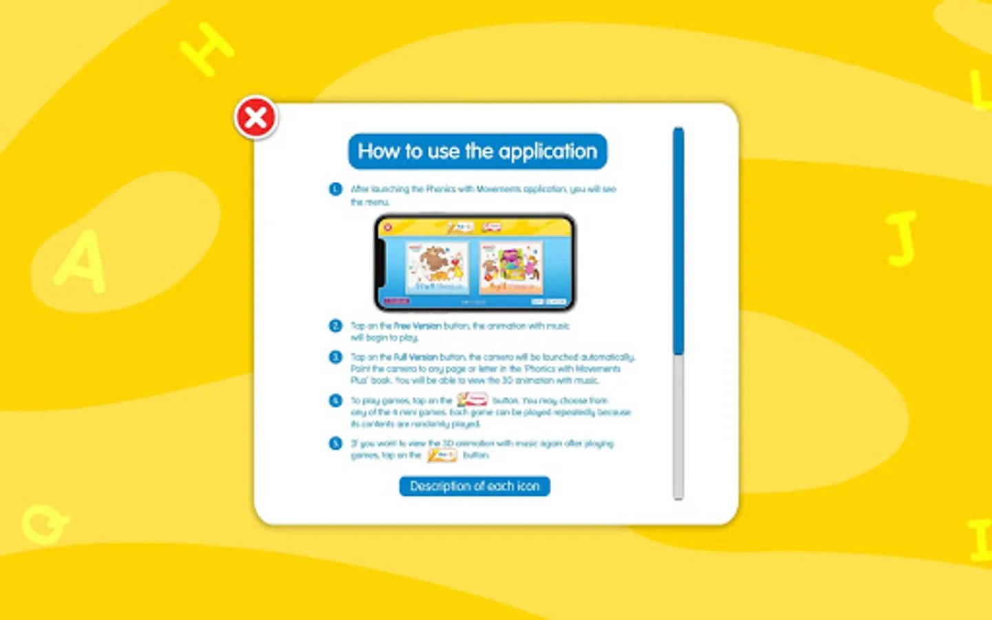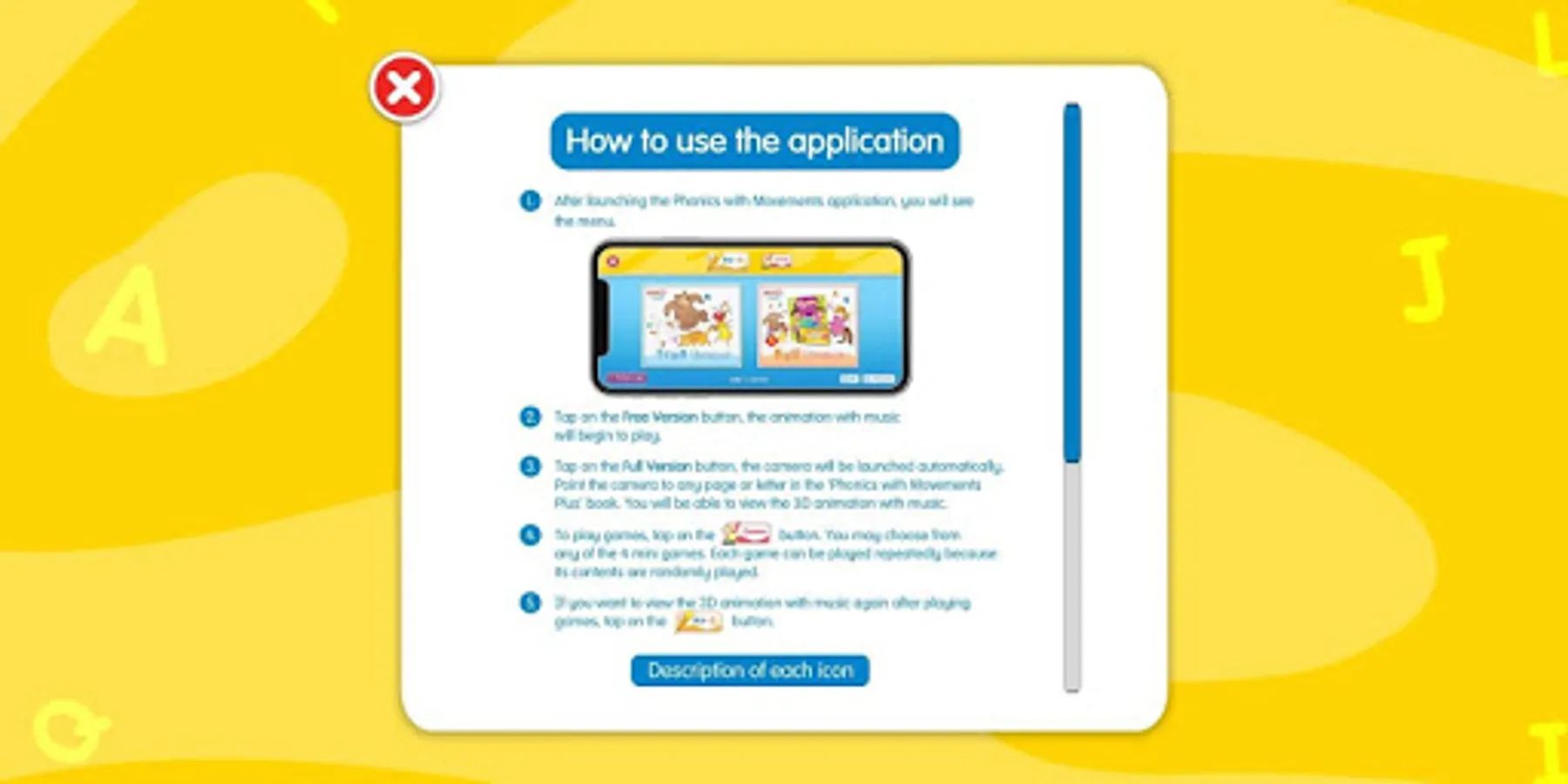 The Phonics with Movements application helps stimulate fun learning of correct English alphabet pronunciation. Simply open the app and scan an image on Phonic with Movements Plus book with the camera and an animation with music appears, together with the correct sound of English letters for pronunciation, from A – Z. The app contains a total of 26 songs and 4 revision activities for even more fun practice of English letter pronunciation.