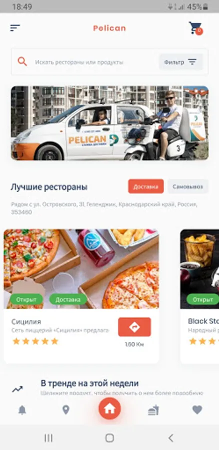 Pelican delivery is a fast and convenient service for ordering food and groceries. Here is a wide selection of dishes and cuisines of popular restaurants and cafes of our city and offers delivery of ready-made meals to your home and office, as well as delivery of fresh products.