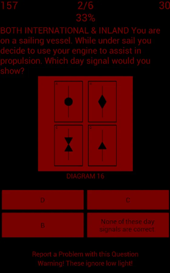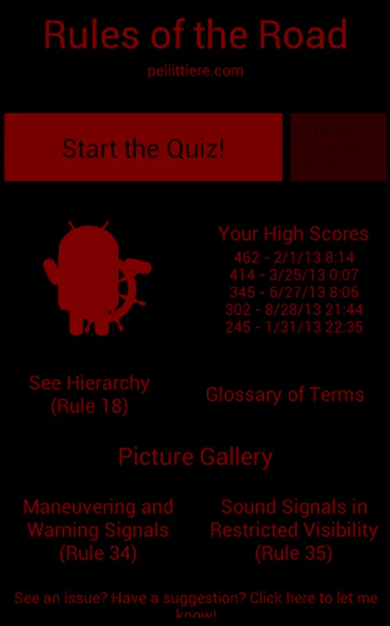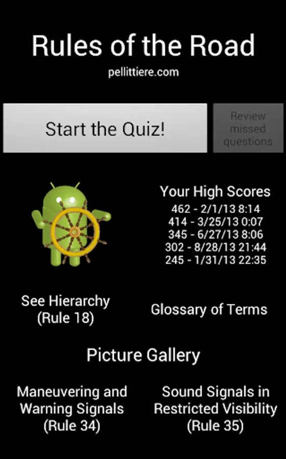 Since this is the Pro Version, you get many additional features: a low light setting, a picture gallery, a glossary of terms, a breakdown of the hierarchy of vessels (Rule 18), cheatsheets for sound signals (Rules 24 & 25), direct navigation to specific questions, and quiz settings.