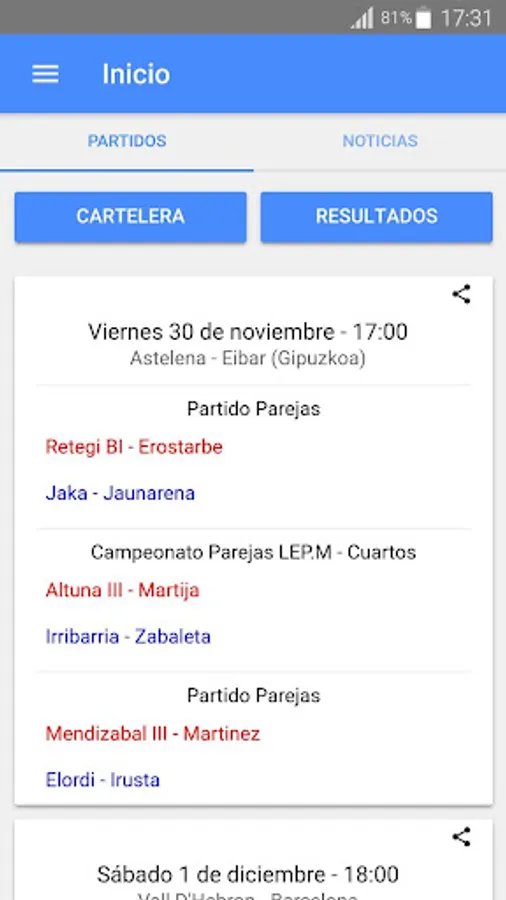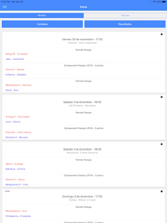 You will be able to see the results of the last matches as well as the next matches to be played. You will also be able to see the latest news related to the ball world as well as detailed information on the different pelotaris that make up each of the companies. In addition, you will be able to see information about the championships, frontons and the record.