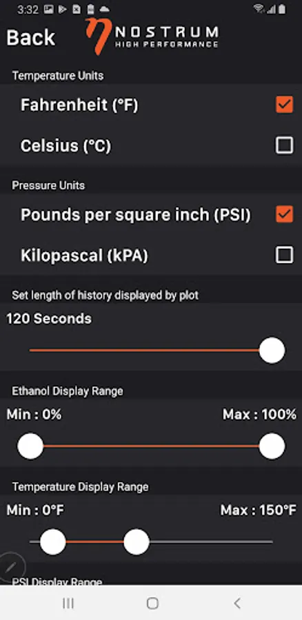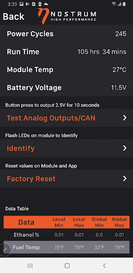 The Nostrum E85 Ethanol Module App works directly with Nostrum’s E85 interface module* and enables you to monitor your vehicle’s ethanol content, fuel temperature, and fuel pressure** directly from your wireless device.
