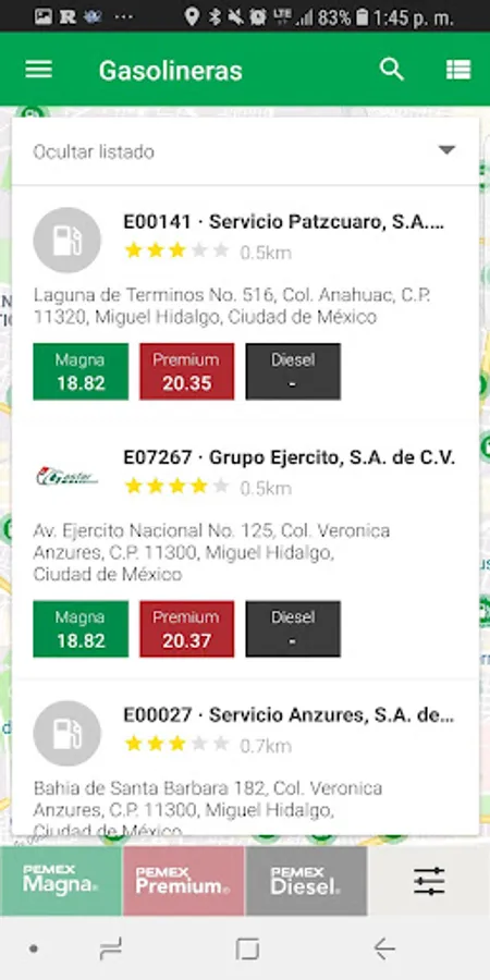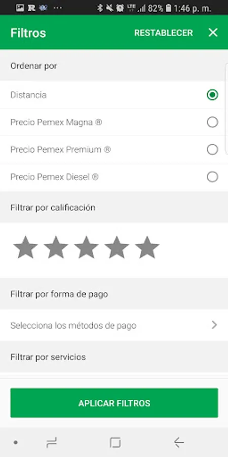 Also, you can filter your search by: distance, combustible type, gas and diesel prices, payment methods received, complementary businesses and reviews of other users like you.