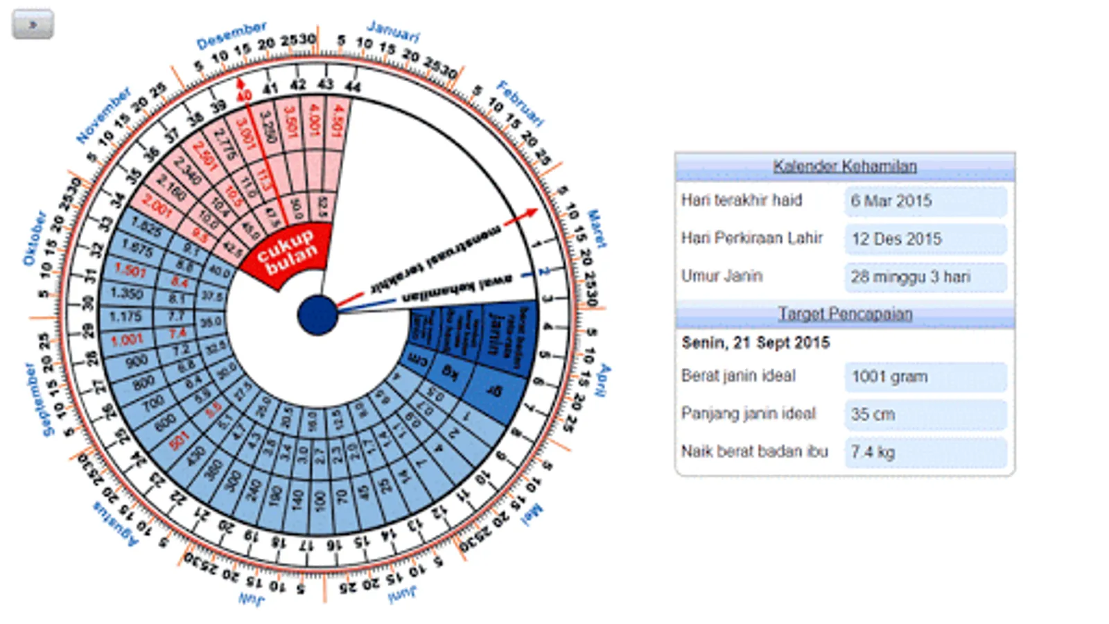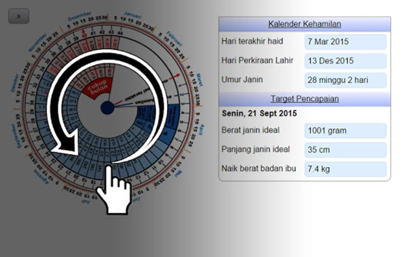 A pregnancy calendar is a calendar application that contains information to locate the approximate day of birth to the baby. Dirposes counting on the last day of the reference period. The determination of the last day of menstruation, it can determine the age of the womb until now and can predict when the time of day and date of birth of the baby.