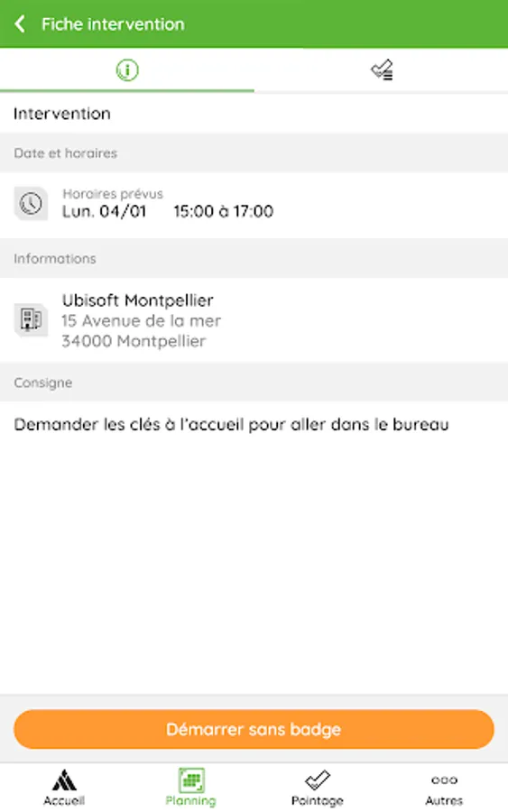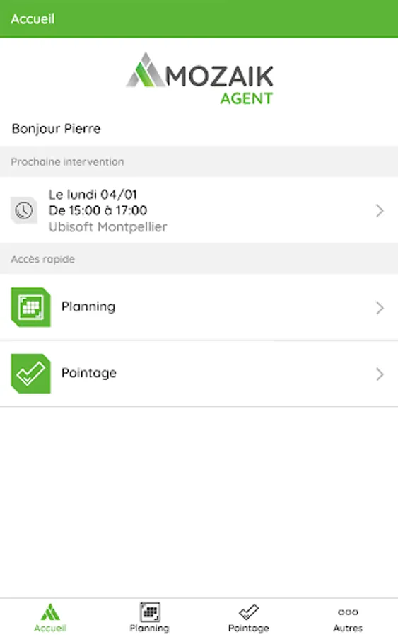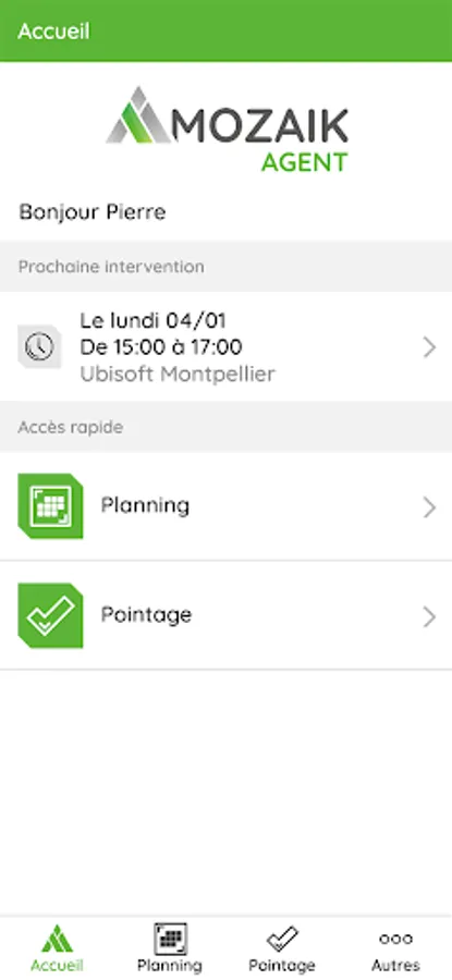 The MOZAIK Agent mobile application allows agents of cleaning companies to clock in at the start and then at the end of their intervention. This information is transmitted in real time for optimal activity monitoring. Other features are also available: planning, anomaly reporting with photo taking, ...