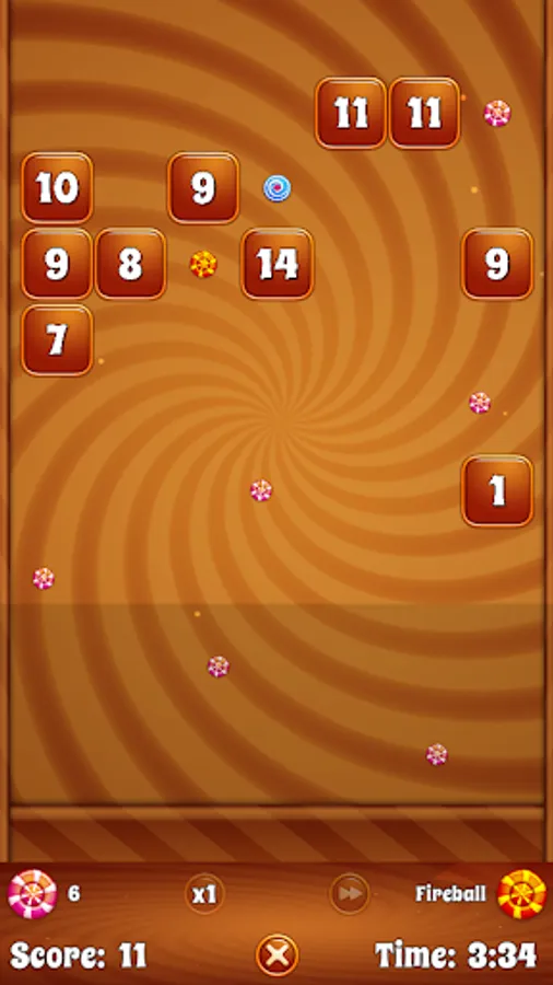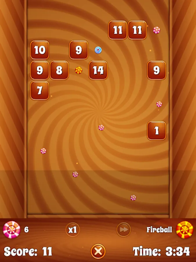 Slide your finger left and right to aim the candy piece, then release to send the candy flying across the screen. Decrease each numbered block to zero to remove it from the game board. But be careful as the blocks are continually descending - if the blocks reach the ground, it’s Game Over!