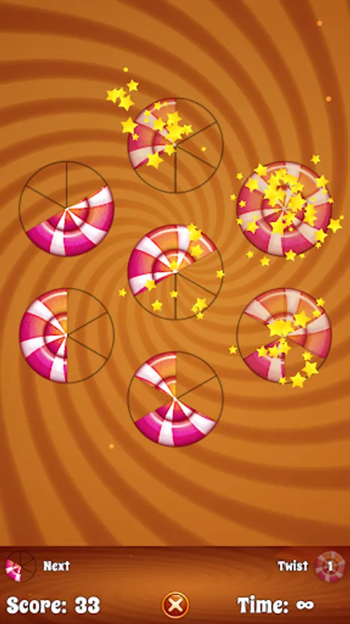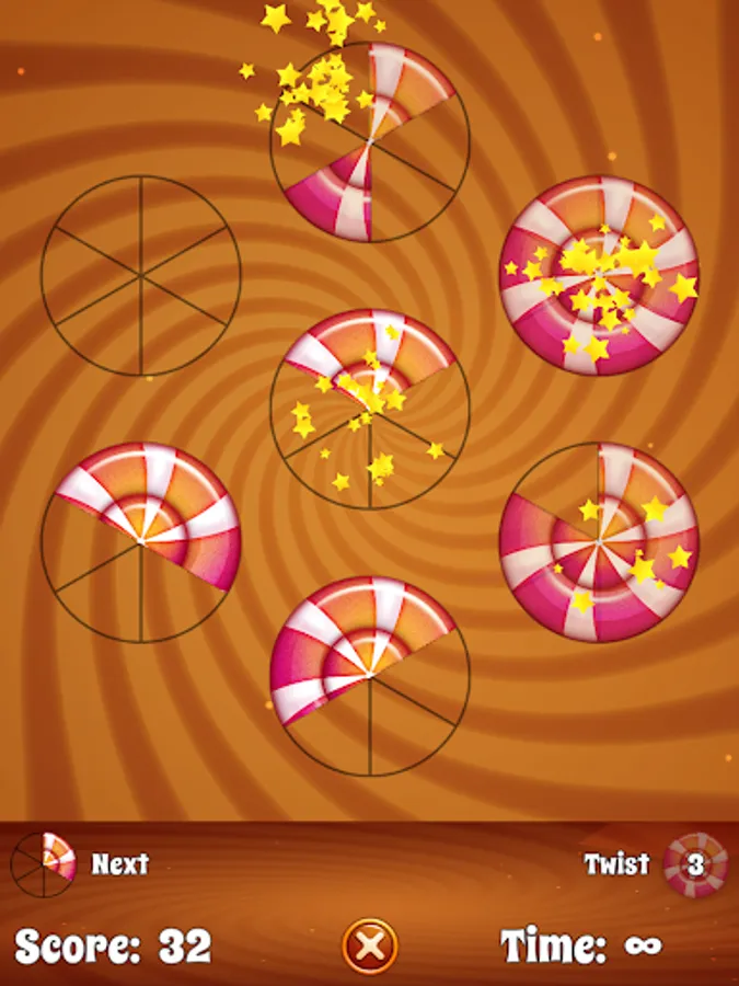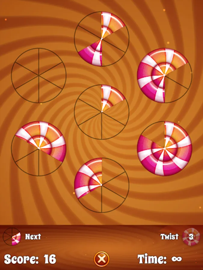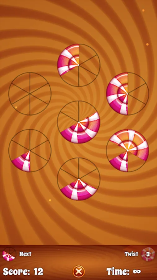 Tap the outer circles to place the current candy piece. Once a candy has been completed it will be removed form the board along with the adjacent pieces. If you run out of moves tap the Twist button for a second chance. But beware - if you run out of Twists, it's game over!