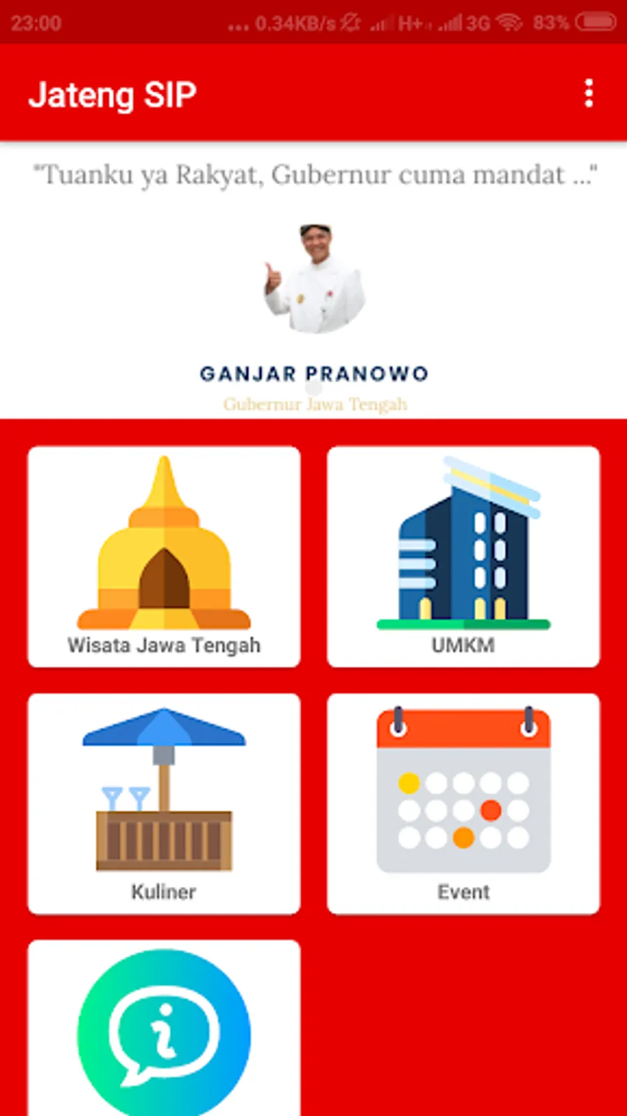 Central Java SIP is an application built by the Central Java Liaison Agency to provide information on various categories (culinary, events, tours, etc.) to the citizens of Central Java. It is hoped that this application can provide benefits