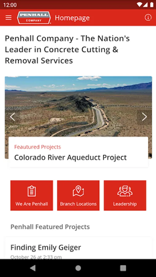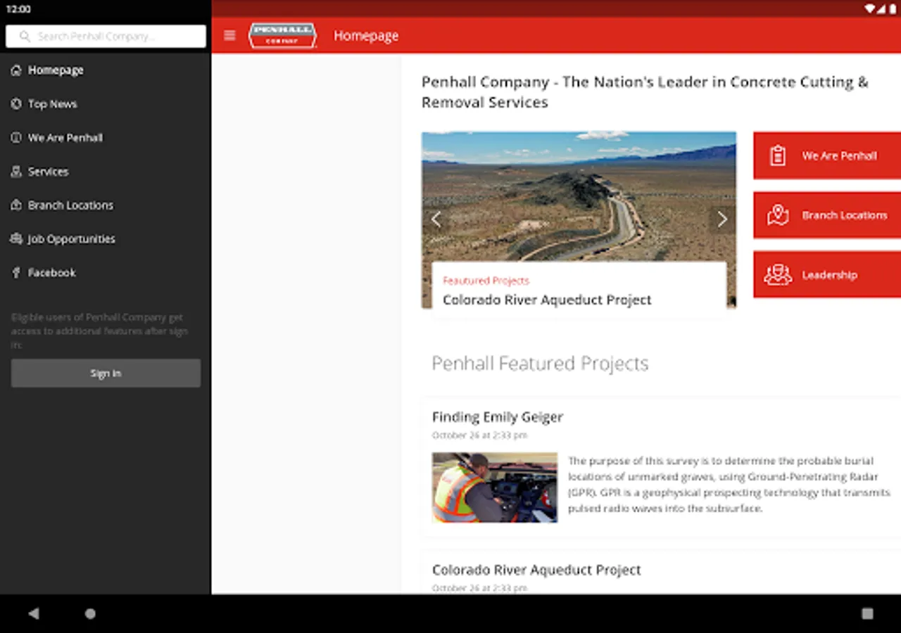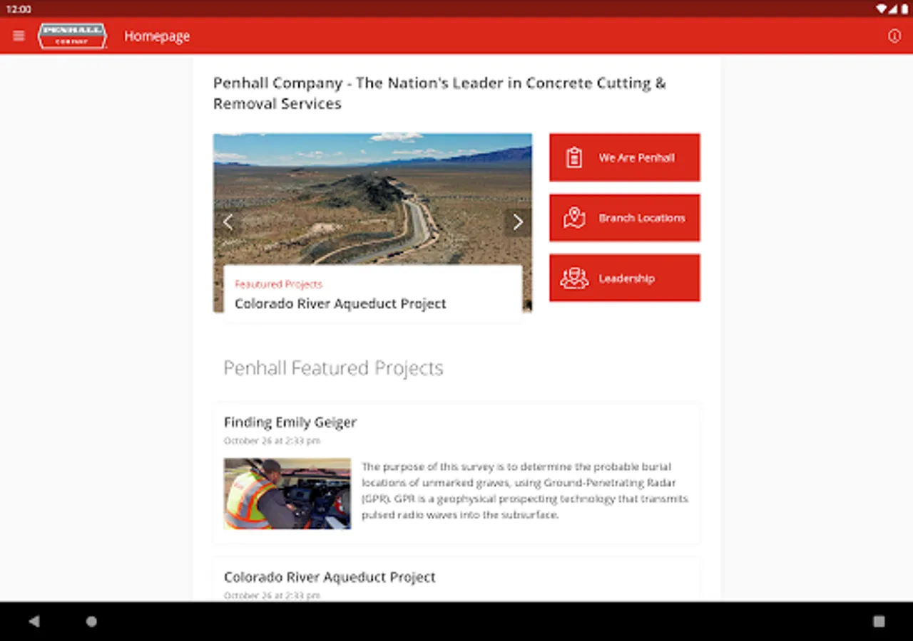 The Penhall Company app is the communication tool for Penhall. Penhall Company is the largest provider of concrete cutting, concrete breaking, excavation and grinding services in the United States. The Penhall Company app keeps you up-to-date with information and news about Penhall Company and its subsidiaries. Download the Penhall Company app to find out about job openings, educate yourself about our Leadership team, or simply find out about our latest projects!