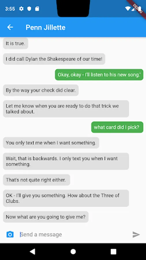 This App is a tool for fooling your friends into thinking they're texting directly to Penn or Teller, who answer with smart-aleck remarks and the punch line to an amazing magic trick. It works 24 hours a day with different replies (and different levels of courtesy) depending on the time of day or mood you find Penn or Teller in.