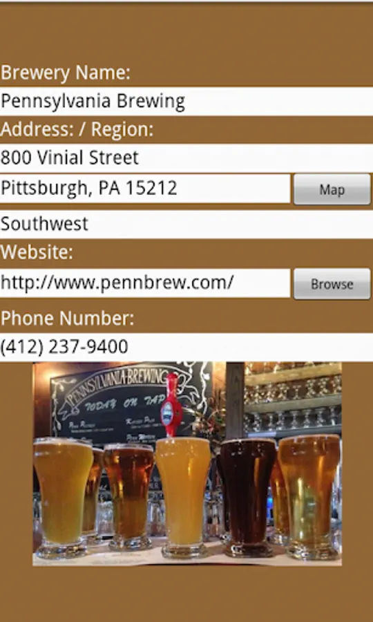 This is the Ultimate Pennsylvania Brewery Finder Application for all brewery enthusiast and hobbyist. Our application contains data contact information on many Pennsylvania Breweries in all regions of Pennsylvania. At a touch of a finger, you can easily find the address, phone number and website on over 100 breweries, brewpubs, microbreweries and tap rooms throughout the state of Pennsylvania.