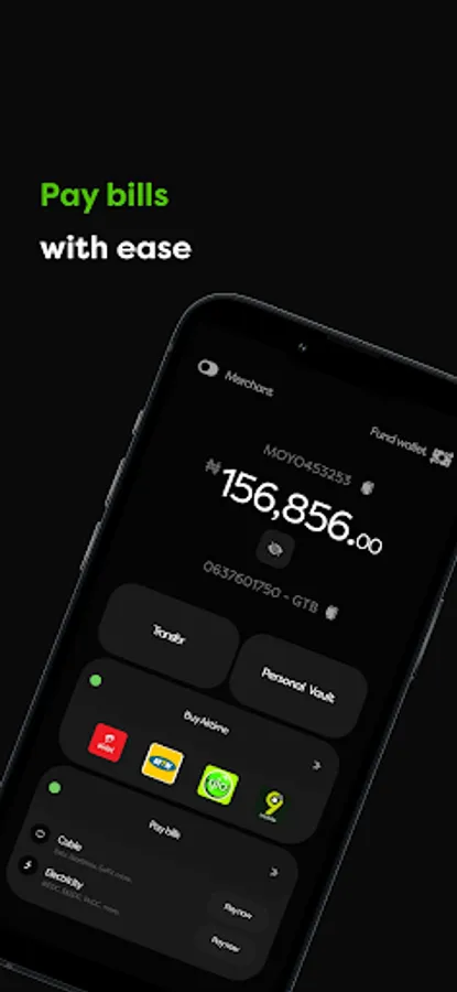 With the Merchant Services offering, you can open a business banking account with a click of a button, receive payments from clients and vendors, generate invoices and receipts, download a stamped bank statement in real time and transfer up to NGN5 million daily.