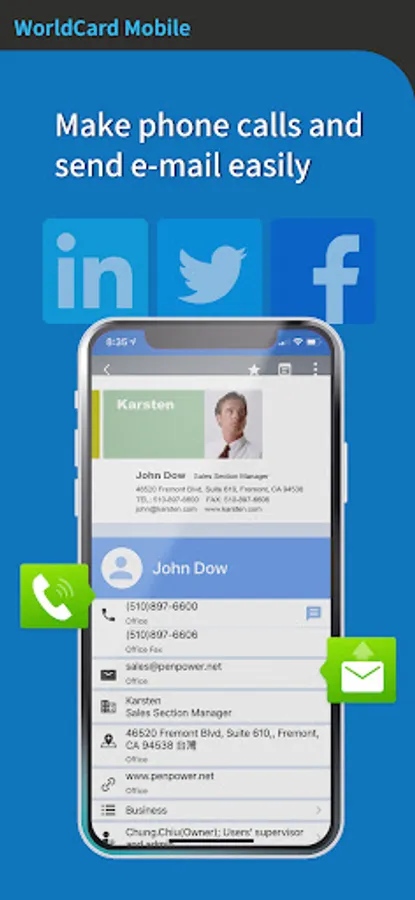 - View and manage contact info with Card holder function. Make a phone call, send SMS and email to your contacts directly.