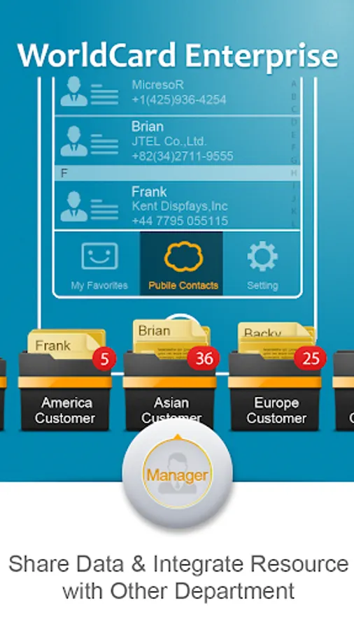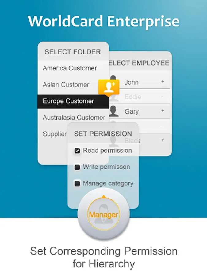 - Able to set individual account and permission, such as read, write card info and mange category. basing on each department or position requirement. Always keep the companies’ contact information up to date.