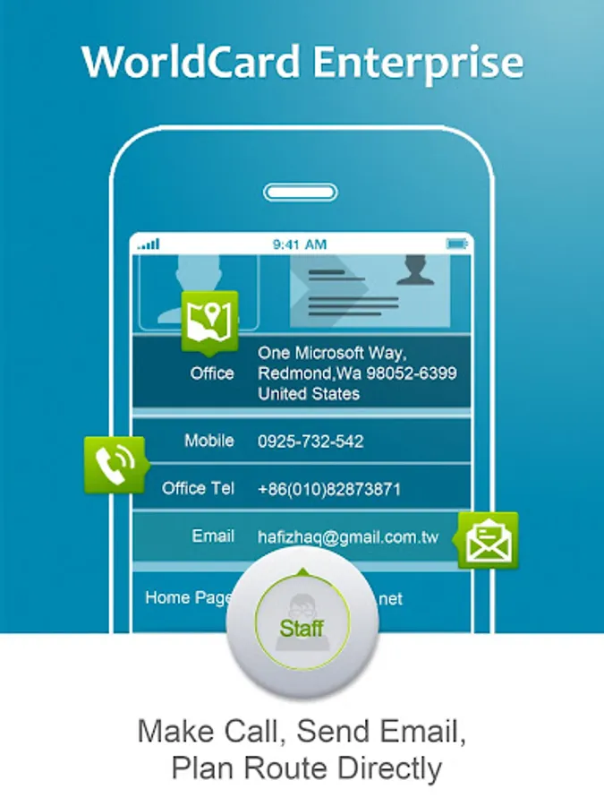 - Provide phone/video call function, send SMS, e-mails via cell phone to contact, congratulate or notify contacts. Quick click on the address fields to conduct route planning before meeting customers. Make the communication between you and your clients smooth and boundaryless.