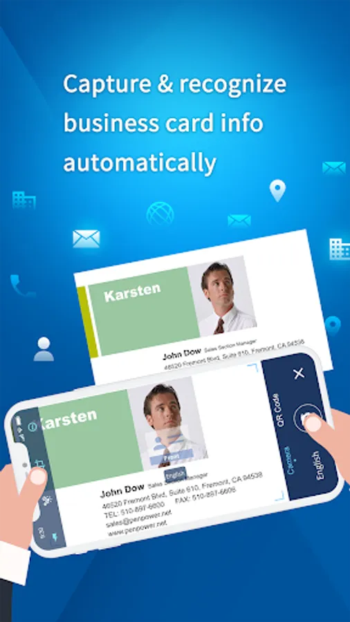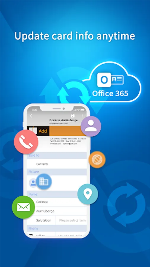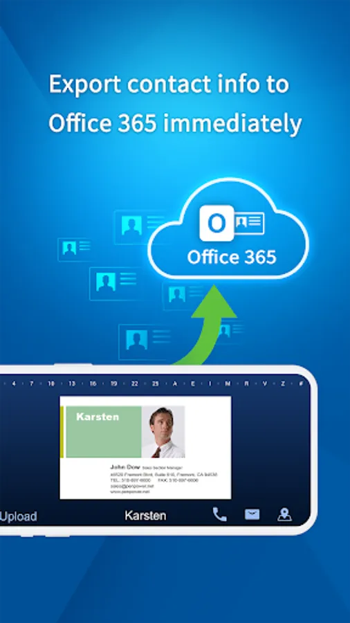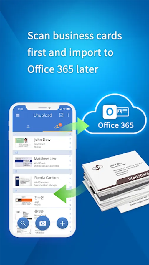 WorldCard for Office 365 is the best business card scanning application for Office 365 users. It uses OCR (Optical Character Recognition) technology to instantly transfer information from business cards to users' contacts. With a simple click on the camera, you no longer have to manually input contact info to Office 365 contacts from business cards or email signatures.