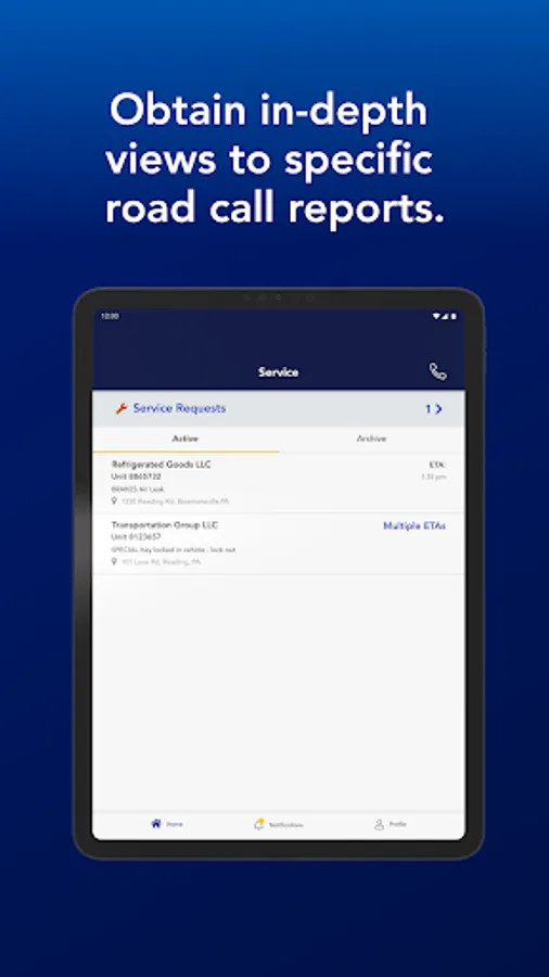 • Road call report details – receive access to issues, breakdown location, unit details plus service history and contact information for a road repair order