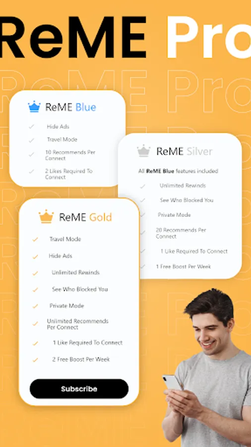 RecommendME is a dating app that is free to download and use. We also offer optional subscription packages (ReME Silver, ReME Gold) and non-subscription, single, and multi-use paid features ( ReME boosts).