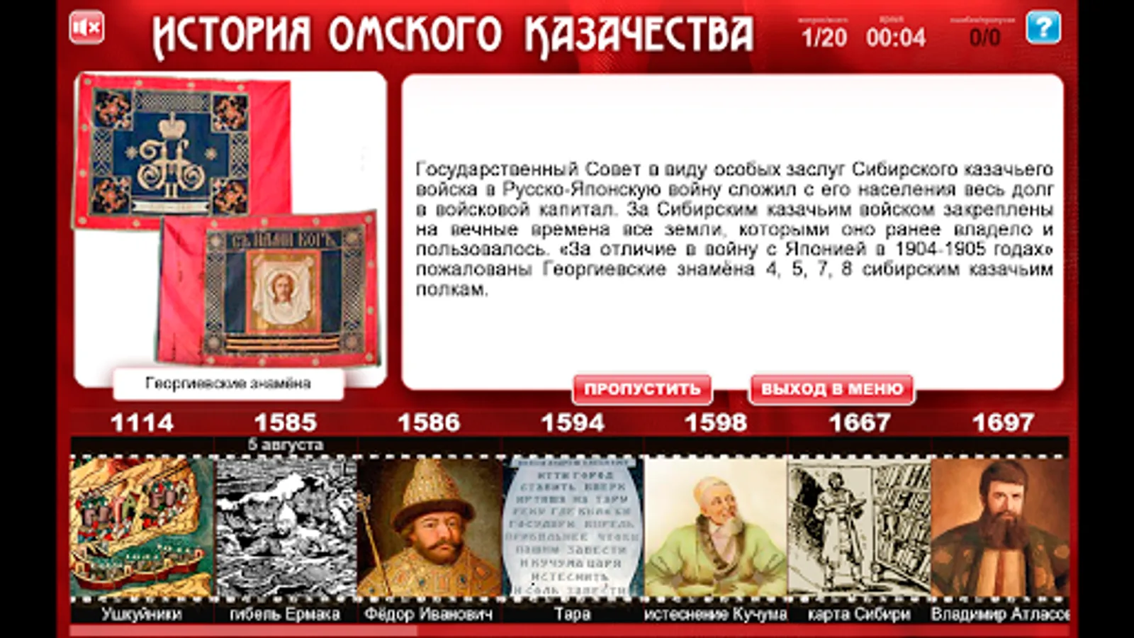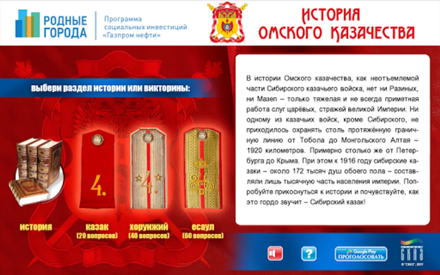 The application "History of the Omsk Cossacks" will acquaint you with the glorious pages of the development of the vast expanses of Siberia by the Cossacks and servicemen. The construction of fortresses and fortifications, creating defensive lines on the border with the restless steppe peoples, the opening of schools, colleges and temples, military exploits and intense daily work. The application works in the mode of a quiz and an encyclopedia and can be used for additional studies of local history.