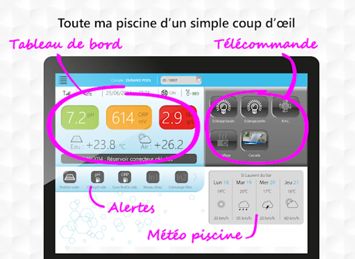 Combined with the devices Maestro, this pool automation application allows you to control and manage remotly one or more pool without subscription.