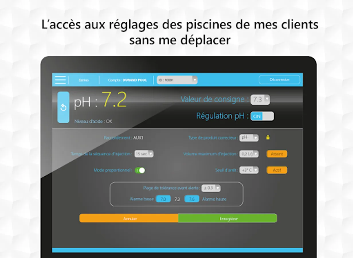 The app Maestro order, among other things, the heating or the lighting of the pool. All the pool paramters (air and water temperature, pH, ORP, Conductivity) are available remotly. The changes are applied to the equipment room in real time.