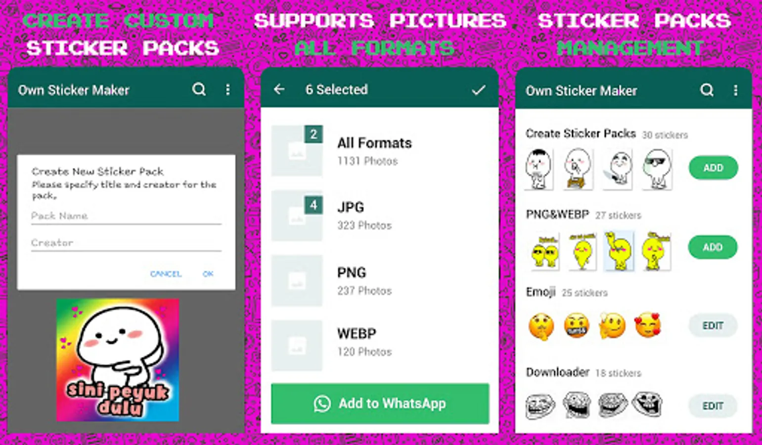 Sticker maker amazing app to pour your own creations this free WhatsApp sticker maker. Create your own sticker pack from WhatsApp. You can use memes, or your own photos, any photo from your phone will work and a sticker maker app inspired by Viko & Co. Various image formats from jpeg, png, webp, gif, all supported by this application. Creating your sticker is easy with our sticker studio, select your photo image, add decoration or text, save and add to WAStickerApps.