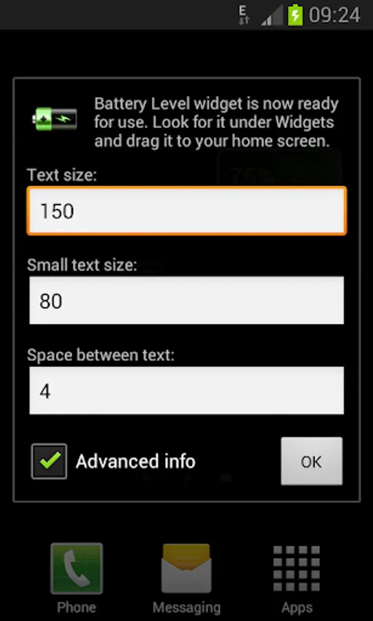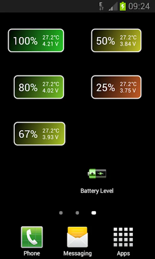 This is a very simple and small battery level widget for your home screen. It can display battery percentage, temperature and voltage. Also it shows battery usage on click. Background color changes from green to red, depending on the battery level.