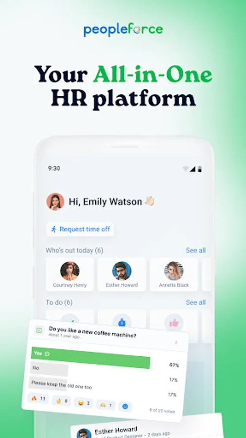 The PeopleForce mobile app enhances the employee and manager experience, improving communication and enabling daily self-service.