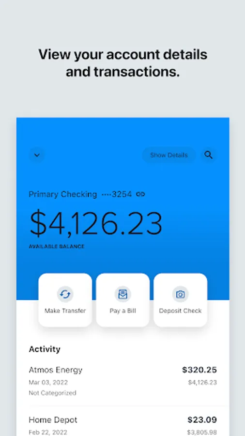 •Submit check deposits using your device’s camera.