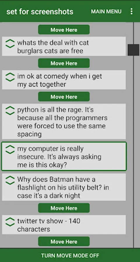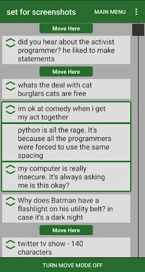 The Set screen lets you arrange the sequence. You can move jokes one at a time, or you can select a sequence to move as a group.