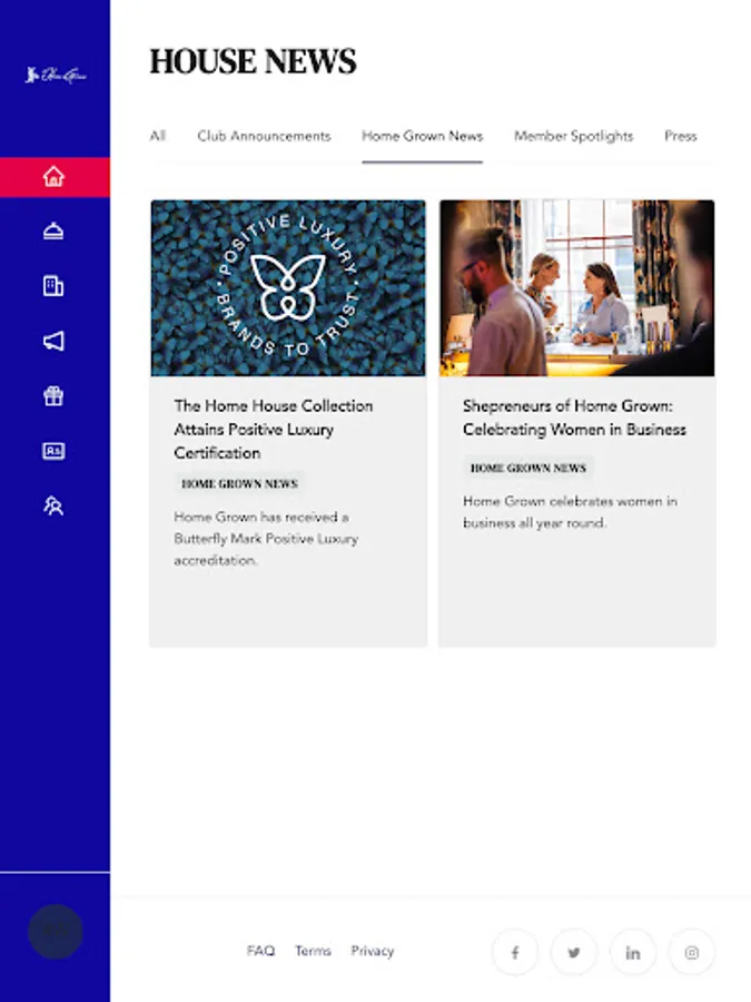 The Home Grown App. Exclusively for Home Grown members to book members' events, tables, bedrooms, meeting spaces connect and view all announcements.