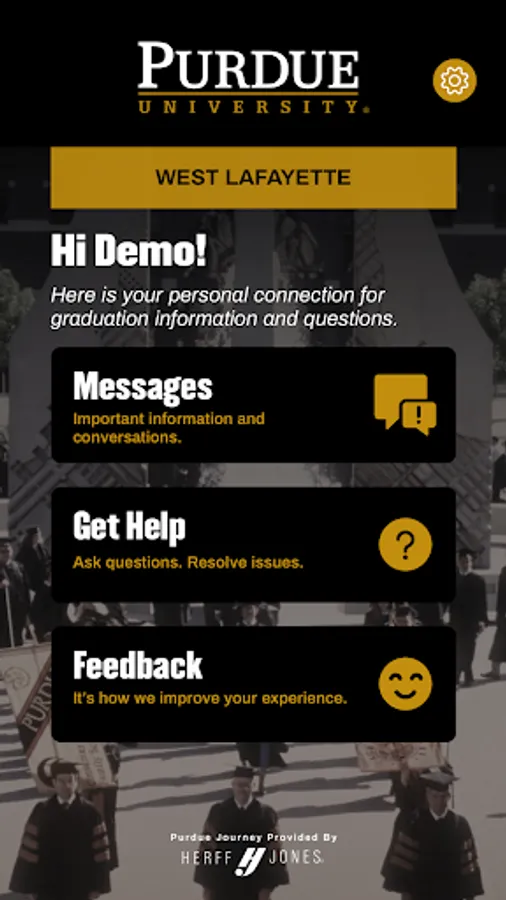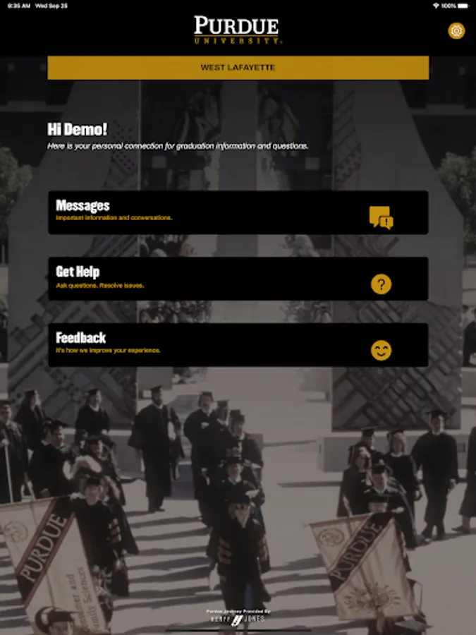 Purdue Journey is the official, private 2-way messaging app to get personalized information and ask questions, about graduation. You will also get important info from Herff Jones about your graduation cap and gown, announcements, diploma frame and more. All your graduation info in one place where it's easy to find.