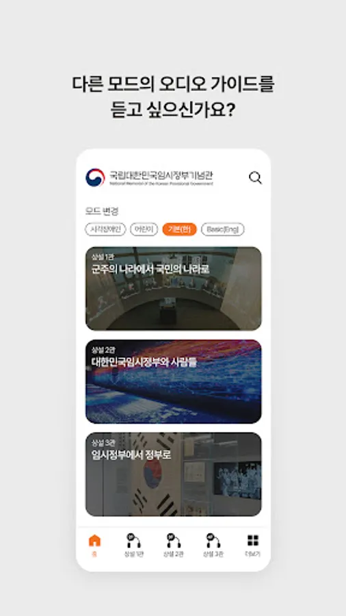 Including the basic Korean mode, we provide a blind mode, a children's mode, and an English guide, Basic mode.