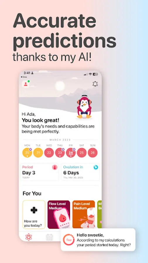 I know your expectations from a menstrual calendar. Starting from the first day you downloaded, I become friends with you and strengthen our friendship with my entertaining and informative advices every day. It's also very easy to be friends with me. I have a very simple usage and thanks to my artificial intelligence, I try to make correct predictions to help you in every way.
