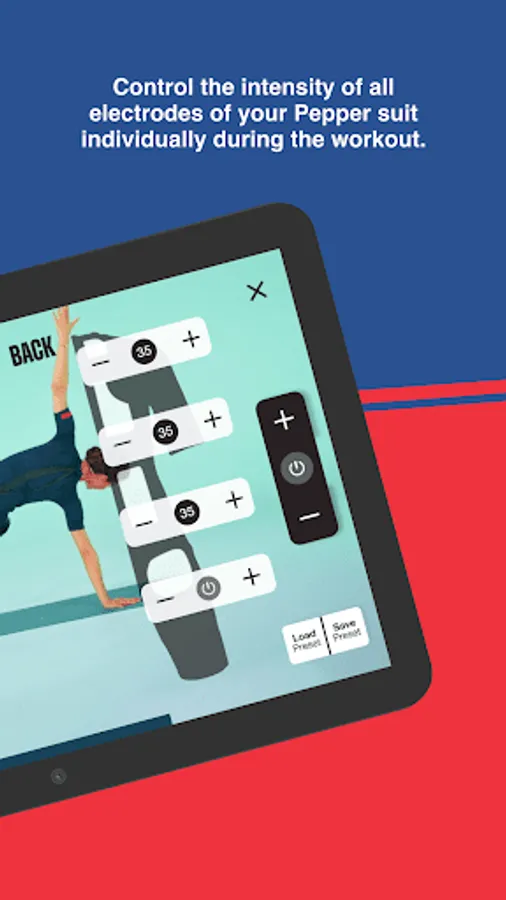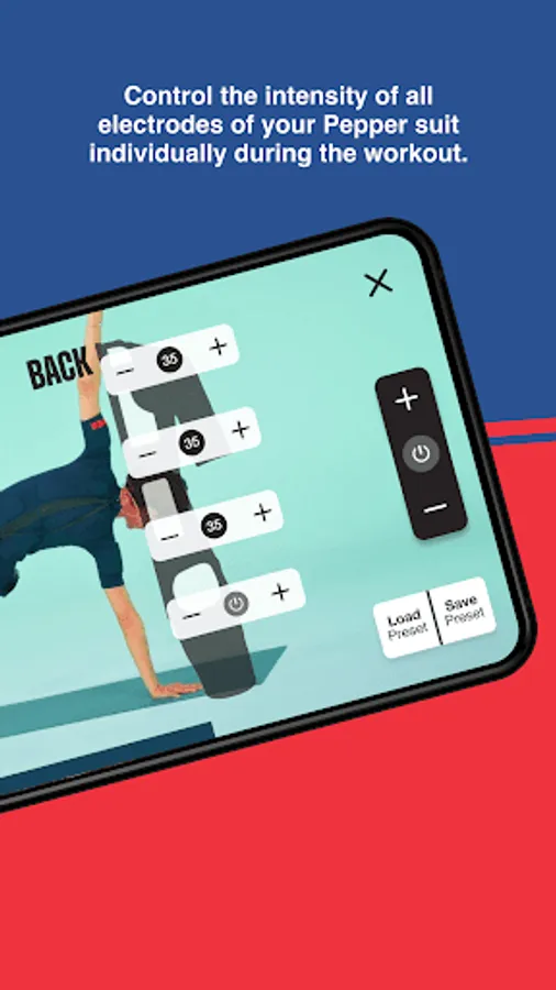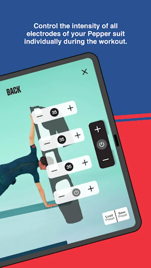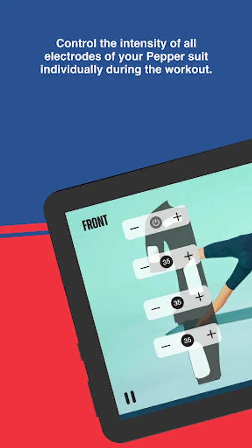 You can tailor your experience by adjusting the intensity for different muscle regions individually. Turn up every area to the level of intensity you desire and even save your intensities for future workouts. Want to train one muscle region only or challenge yourself by using all major muscles of your body to the fullest potential? With the Pepper suit and app, you can do both.