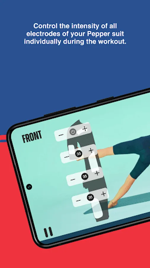 Train anywhere and anytime with your Electronic Muscle Stimulation suit and app by Pepper. Choose from a constantly evolving library of EMS-tailored workouts for strength, yoga, and cardio, developed with leading EMS experts. Alternatively, intensify your own workout routines and use the app to only control your suit. The best fitness experience for beginners and experts alike. Adjust the EMS impulse intensity for every major muscle region individually to fit your needs and fitness level.