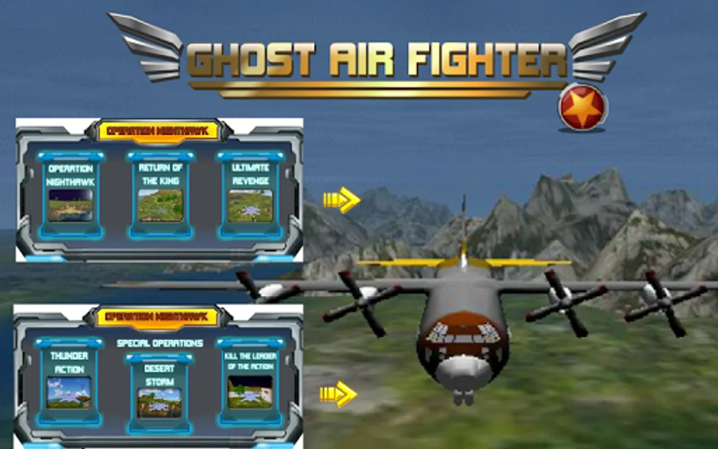 Before you start fighting, You can choose your favorite fighter, Game round display using three-dimensional characteristics of each aircraft,You can see every corner of the aircraft, then choose your favorite the plane, and then drive your plane to fight with the enemy, no failure, only success adowa the enemy, to get the supreme command issued by the sacred medal! The combat contains multiple modules: operation nighthawk, beheaded action, desert storm, thunder, the return of the king, the ultimate revenge, we must complete all the tasks to be successful, come on!