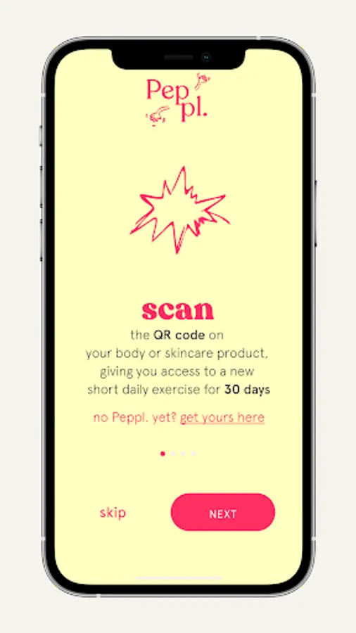 1. SCAN the Peppl. QR code sticking on your body or skincare product or the one you got on www.pepplhabits.com, this opens the Peppl. app to play your exercise of the day